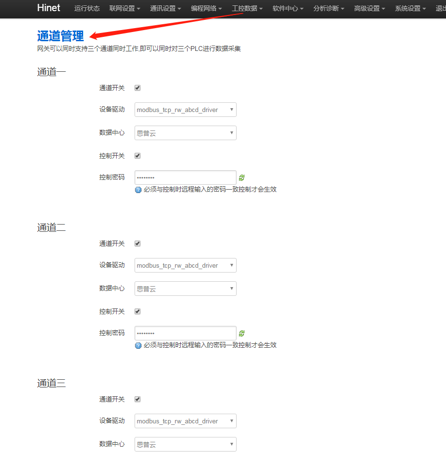 2. 后臺通道與平臺上所選通道不一致,網關后臺“工控數據 - 通道管理”打開的是通道1,思普云平臺設備管理處,設備綁定網關時通道選擇1。