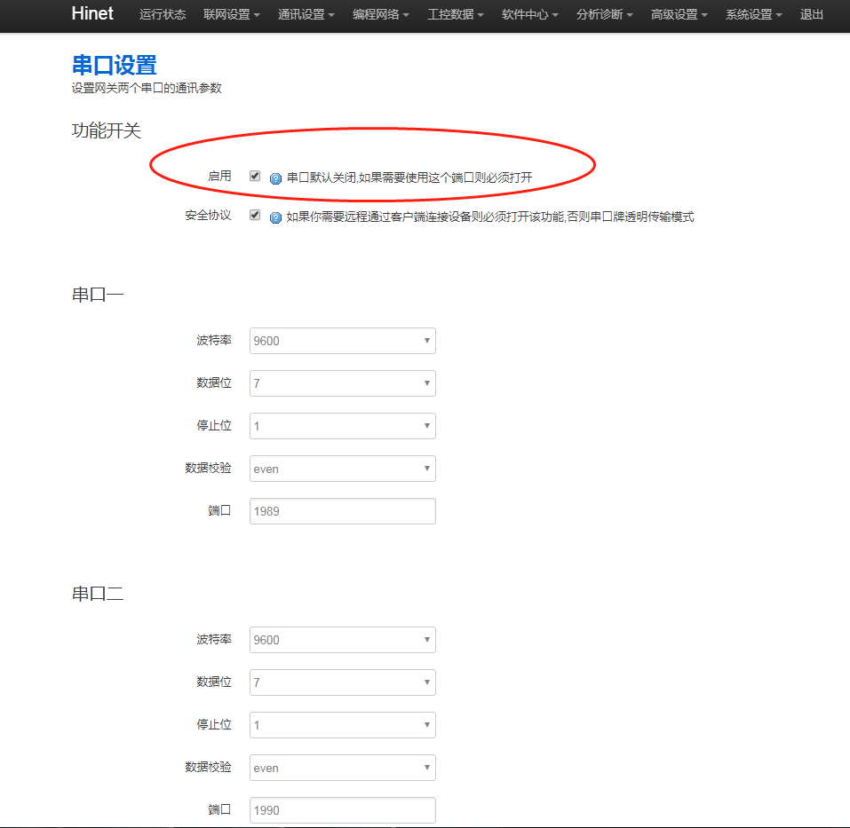 1. 網關串口功能是否開啟,進網關后臺,點擊“通訊設置 - 串口設置”,串口勾選【啟用】。