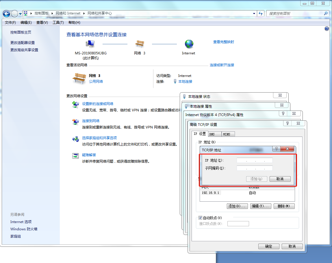 點擊“開始 - 控制面板 – 網絡和Internet - 網絡和共享中心 - 更改設備適配器”找到物理網卡,鼠標右擊“屬性”,選擇Internet 協議版本 4 (TCP/IPv4),點擊“屬性”,添加一個同網段IP。